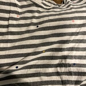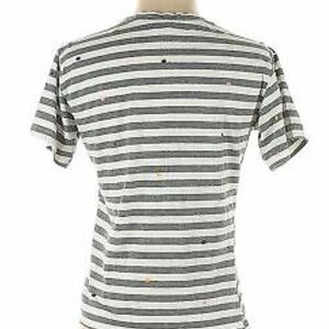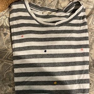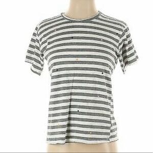This casual-chic t-shirt from Current Air is a fun and unique twist on a classic striped tee. It features a gray and white horizontal stripe pattern with small, multi-colored polka dots scattered across the fabric, adding a playful pop of color. The distressed details give it a worn-in, vintage feel. This is a versatile top that's perfect for a relaxed weekend look or for layering under a jacket.