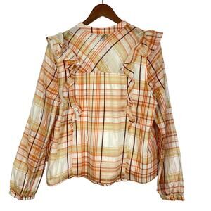 Current Air x Anthropologie | Polly Orange Plaid Ruffle Trim Silk Blend Blouse
