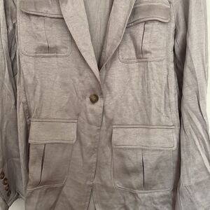 Current Air silver blazer jacket with 4 pockets size S has extra buttons nwt jacket that is missing soft cinch belt, has original Anthropologie tags