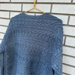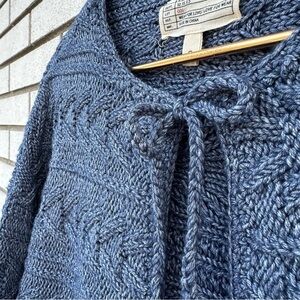 This sweater has all the of-the-moment trends: indigo dye, chevron cabling, and rows of fringe. An oversized fit and poncho style tie neck make this the perfect cozy and chic sweater. Thick and cozy open style cardigan.