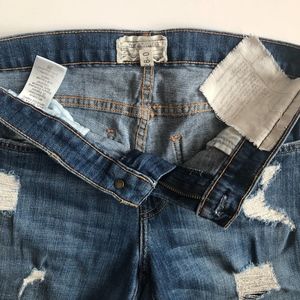 Condition: Pre-Owned, there are no holes where holes are not intended, but due to the nature of the distressing some holes have ripped a little more and one spot has been reinforced. (see pictures)