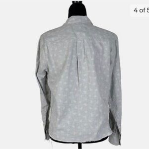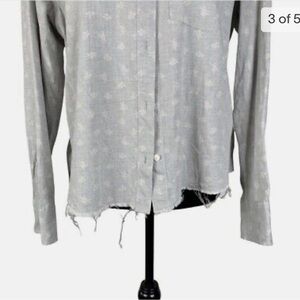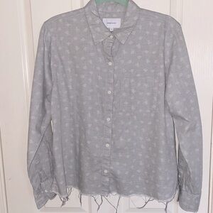 Relaxed oversized boyfriend fit button down shirt. The hem has intentional distressing. Open patch single pocket in the chest. Gray fabric with white floral motif throughout. Good condition. Size 3 which is equivalent to a 10-12.