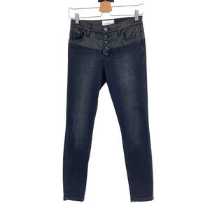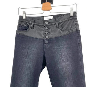 Super cool faux/vegan leather detailed skinny jeans from Current/Elliott. Button front detail. Mid rise waist. Cropped length.