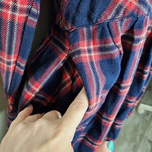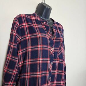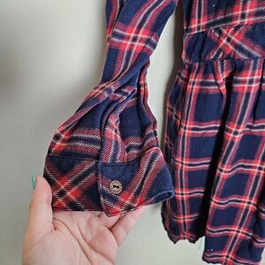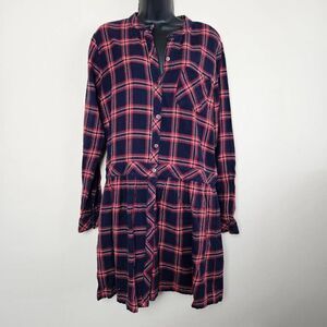 The schoolgirl dress by Current/Elliott has a classic plaid pattern in navy blue with red stripes. It features a button-up front with long sleeves. The dress has a casual and preppy vibe, thanks to its plaid design, and the structured collar and chest pocket add a tailored touch. The skirt flares slightly below the waist for a feminine silhouette, making it a comfortable and stylish option for a casual day out. There is an extra button sewn on to the inner tag.