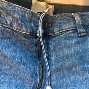 Medium wash with whiskering and fading. Front zip and button closure. Raw hem.