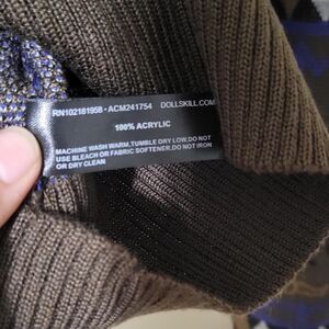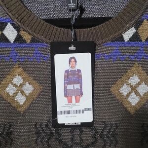 Current Mood "Autumn Edge" Knit Sweater, new with tags from Dolls Kill. A rich brown base with a striking argyle and geometric pattern in shades of cobalt blue, tan, white, and black - perfect for embracing sweater weather in style.
