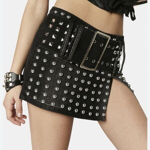 Elevate your style with this edgy studded black mini skirt. Perfect for a bold, fashion-forward look.