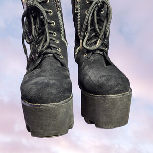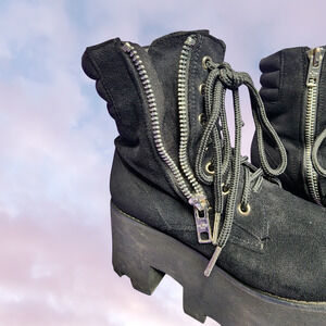 Current Mood Greenpoint Dolls Kill Platform Black Faux Suede Goth Punk Grunge Party Double Zip Up Festival Rave Boots. These boots are so fun, perfect for music shows / festivals. They are super cute for a variety of outfits such as flare pants, worn with tights and a cute funky bodysuit, or a skirt.