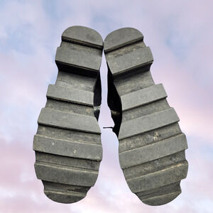 Condition: Some scuffs here and there around the toes and along the bottom platform sides shown in photo's 4, 5 and 8. One of the bottom outsole pieces is starting to split from the bottom shown in photo 8. Reflected in the price. These boots are still very much wearable and have lots of romping life left in them.