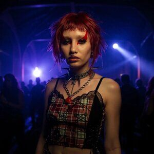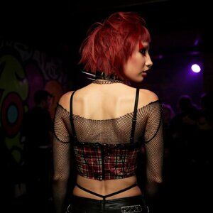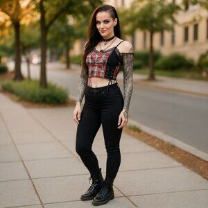plaid crop top, alt-core fashion, y2k punk style, layered look, lace-up corset top, current mood, mesh layering, rebellious outfit, witchy streetwear, electric oracle capsule, metaphysical fashion, statement top, festival wear, punk revival, dollskill style