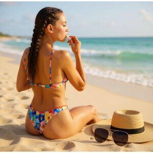 • Two-piece bikini set: plunging top + cheeky V-cut bottoms