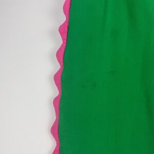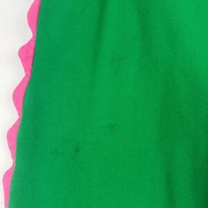 • Bright green front, cobalt blue back, pink waist/cuffs/ruffles