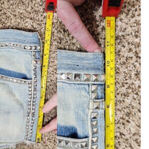 Measurements: waist: about 17in, rise: about 10in, length: about 10 & 1/2in, leg opening: about 1ft