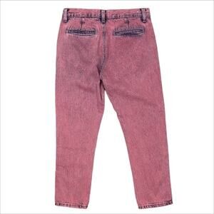 Cut from a stiff cotton denim. Tailored in a straight leg with a high waist. Zipper closure. Front slit pockets. Back hidden zip pockets. Pink acid wash. 100% cotton. Like new.