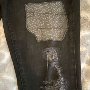 Awesome pair of designer jeans that are distressed black with genuine leather, suede and lace patches. They are new and perfect for a night out on the town. Retail $280. Smoke free home