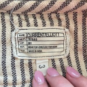 Current Elliot Striped Blouse. Gray and tan heavy duty linen feel. Blue stitching across front with gold buttons. Light stain inside collar. Great used condition size 3