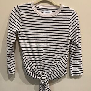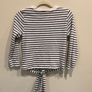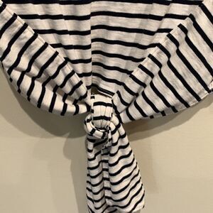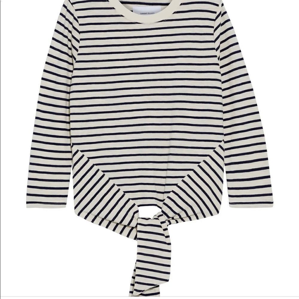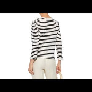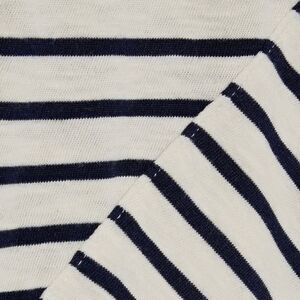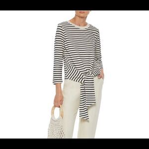 The Birkin Tie-front Striped Cotton-blend Jersey Top. Dark navy stripes. Off white background.