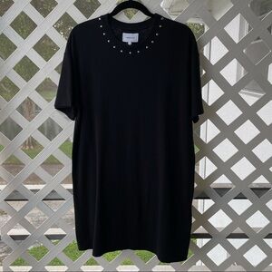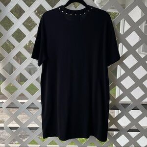 Get ready to rock out in your new favorite dress! With it’s relaxed fit & loose silhouette, silver stud trim neckline, and a worn-in look thanks to the destroyed edges, this t-shirt dress is everything! Pairs as easily with Converse or combat-style boots as it does strappy heels or over-the-knee boots!! It’s anything but basic and everything rocker chic!