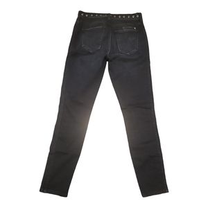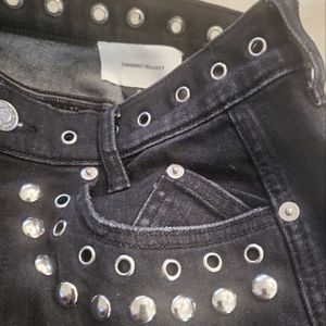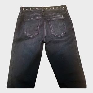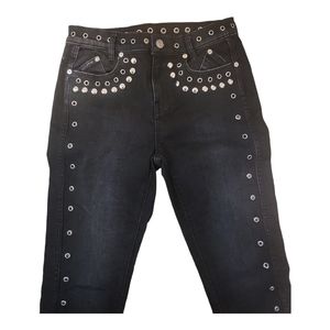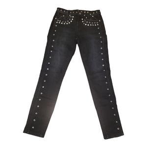 This pair of designer jeans from Current/Elliott is a must-have for any fashion-forward woman. It features a high waist, mid rise, ankle length, and skinny fit, making it perfect for any occasion. The studded accents give it a unique edge, while the color name luminary ( a slightly faded black color) adds a touch of sophistication. The fabric is a cotton/ elastane blend and is machine washable for easy care. Silver studded, 7 pocket design. Originally $348.