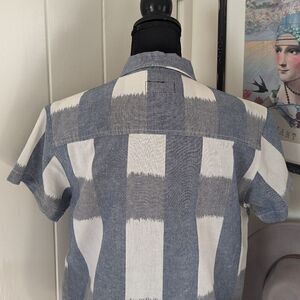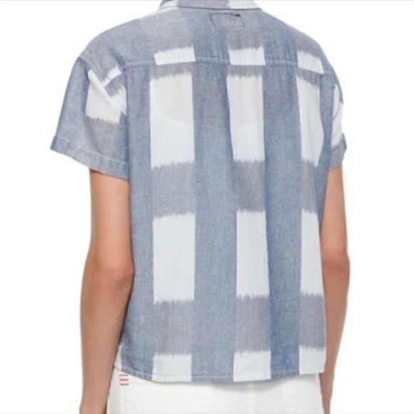 Description: Current/Elliott The Emma Button Front Shirt Tokyo Revival sz 1 (equivalent to small) Coastal Preppy Academia Minimalist Retro Chic, boxy silhouette with a slightly cropped hemline, combines vintage vibe with classic details, features large check print, collar and full button placket, comes with spare button.