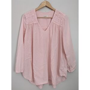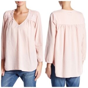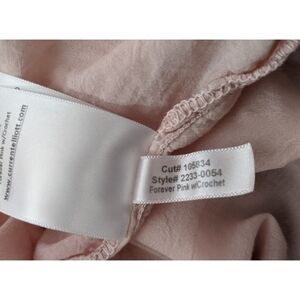 Very good pre-owned condition. Current/Elliott Picnic shirt with crotchet detail shoulders. Color is Forever Pink. 100% cotton. Size is 2 which is Medium/Large.