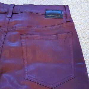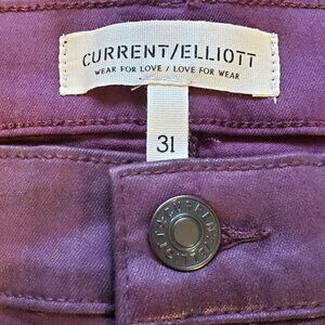 These Current/Elliott coated jeans in Fig Jam purple are in women's size 31. The coated, or waxed denim, gives the look of leather. They feature a high rise, full length, wide bootcut leg, and a 5-pocket design. Made from a comfortable, stretchy blend of cotton, modal, polyester, and spandex.