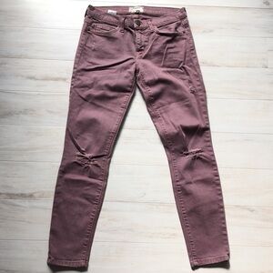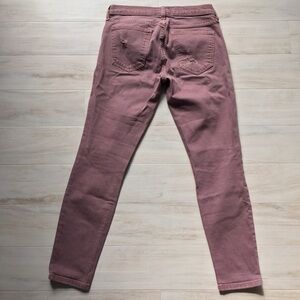 Beautiful dusty rosy taupe color. In excellent used condition. Distressed style. Size 27. Inseam is 27 inches, waist is 15 inches laying flat.