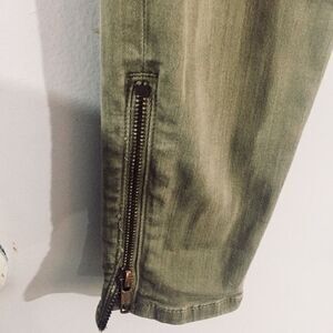 Tuning into the runway's military mood, these current/elliott skinny jeans take surplus style to the streets with an army-green wash and utilitarian zip accents. 70% cotton/14% polyester/14% viscose/2% elastane. Made in the usa. Belt loops, zip button fly. Front zip pockets and cuffs. Back slit pockets. Color: Army green