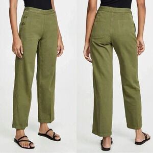 The Current/Elliott Military Cropped Pant in Army Green is a solid patterned chino style pant with a wide-leg fit and a 30-inch inseam. The pants are made of a lightweight and breathable cotton and linen blend material. The pants feature a button and pull-on closure, and are machine washable. They have pockets and are easy to care for. The pants are suitable for travel, casual wear, school, and workwear, and are available in size 31. The faded pocket on the back is made that way. Comes from a smoke free home and pet friendly home. Measurements taken flat with garment un-stretched. Please ask any questions that you may have.