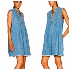 Adorable little denim dress with raw hem, not too mini and really great to layer things under. It's marked a 0 but it fits more like a small if you want it oversized, medium if you want it a little oversized, and medium if you want it more close to the body