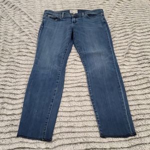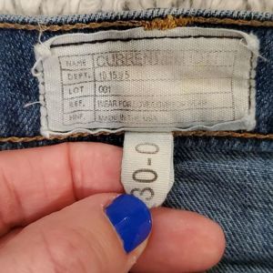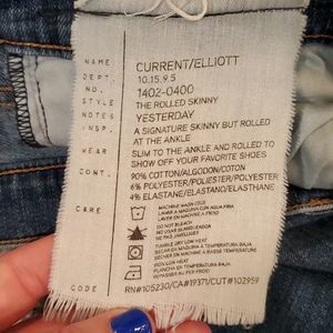 31" inseam; 11" leg opening; 9" front rise; 13 1/2" back rise (size 29).Zip fly with button closure.Five-pocket style.Belt loops.92% cotton, 7% polyester, 1% spandex.Machine wash, tumble dry low.By Current/Elliott; made in the USA.