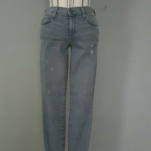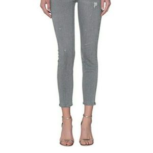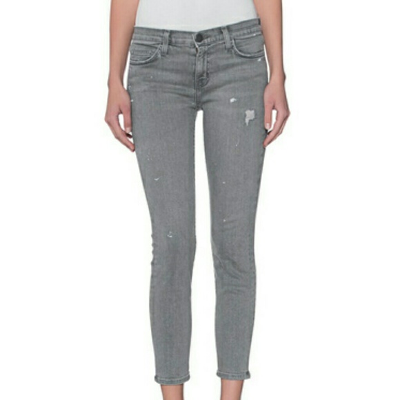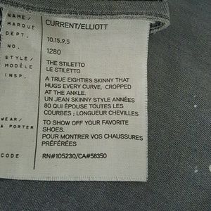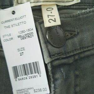 Current/Elliott "The Stiletto" jeans in Sellwood Destroy (distressed light gray) wash.Approx. measurements: 9" rise; 26" inseam; 10" leg opening.Five-pocket style.Low rise.Fitted through skinny legs.Cropped above the ankles.Button/zip fly; belt loops.Cotton/elastomultiester/spandex.Made in USA of Italian material. Soft/broken in feel. NEW