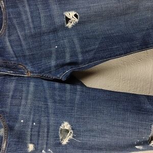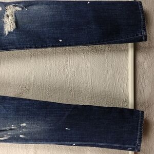 Current/Elliott The Skinny Women's Blue Dark Wash Five Pocket Button/Zipper Front Closure Ripped Distressed Paint Platter Skinny Jeans. 99% Cotton, 1% PU. True Eighties Skinny Jean To Hug Curves. Measurements approx. Flat Lay. Waist: 16, Rise: 8, Hips: 18, Inseam: 32. Size 27.