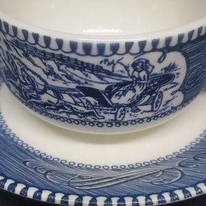 Currier & Ives Blue Flat Cup and Saucer Set Height: 2 1/8 in Width: 3 5/8 in Special Characteristics: PLAIN POINT HDL Crafted In USA Dishwasher Safe, Oven Safe Pattern: Currier and Ives Blue by Royal (USA) Status: Discontinued. Actual: 1950 - 1970 I have 6 listings for this set that can be bundled.