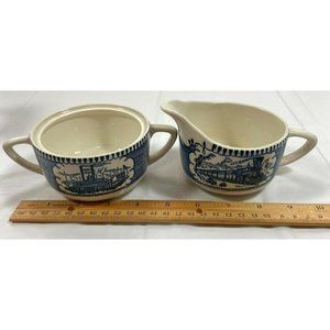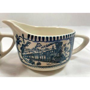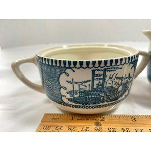 Currier & Ives Royal China Sugar and Creamer Bowl Train Paddle Boat Blue No Lids