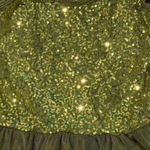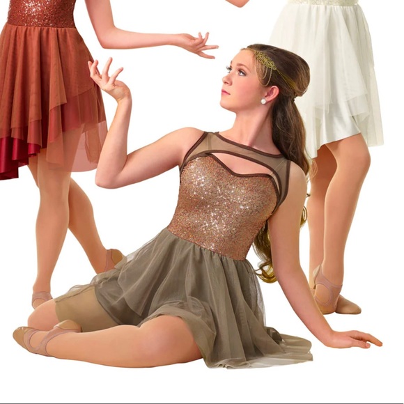 Ivory Nylon/spandex, sequin poly/spandex, and sheer motion mesh leotard with binding trim and attached sheer motion mesh and Silhouette poly/spandex skirt.