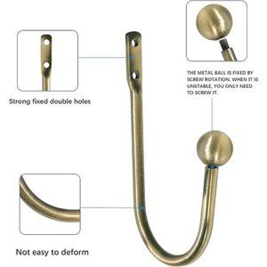 DescriptionAmazing heavy duty metal curtain holdbacks, excellent to give your room a quick and easy revamp.These drapery tiebacks are very easy to install, and coming with screws. Not only apply to curtains holder, but also can hang coat, hat, towel and clothing and so on.The basic curtain hooks provide a neutral look that blends naturally with drapes.Drapery holdbacks makes opening and closing the drapery panels very easy, and they don't wrinkle the drapes as much as the tie backs.SpecificationMaterial: MetalSize: 6"(15 cm) in length, 2.8"(7 cm) in width, diameter of hook: 0.3"(8 mm)Color: BrassPackage included4* Metal Curtain Holdbacks8* Screws8* Anchors