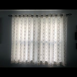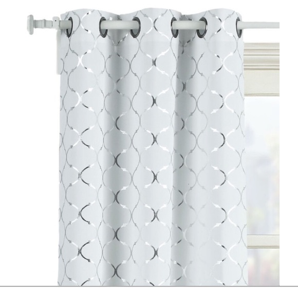 White with silver trellis design curtain panels with grommets. 4 panels available each one is 38” wide by 63” long. Excellent like new condition, they are only approximately a year old, I just decided to replace them with zebra blinds. The price is for all 4 panels.