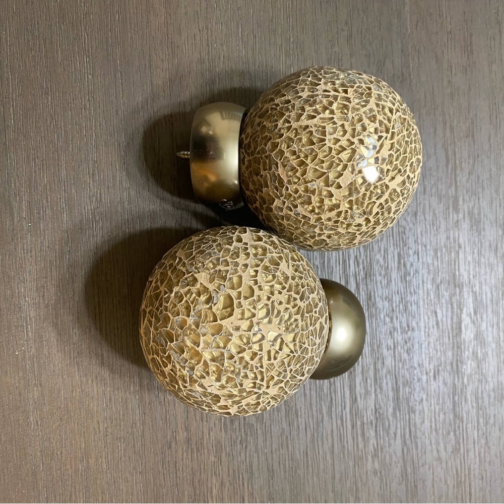 Curtain rod end knobs. Gold/bronze color, mosaic style. Knobs are between 2.5 and 3 inches. Smoke free home. Questions? Leave a comment below!