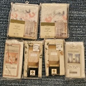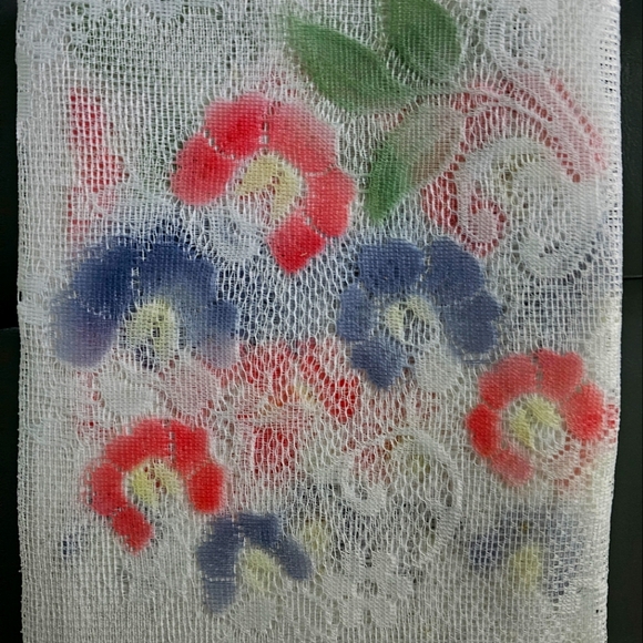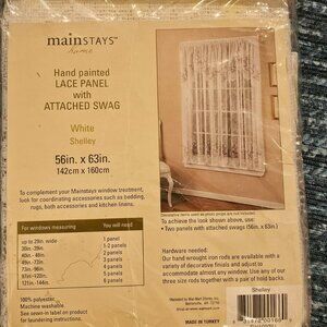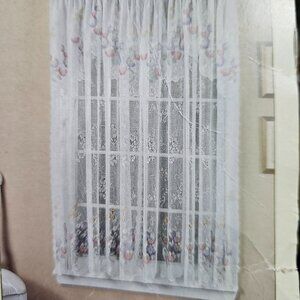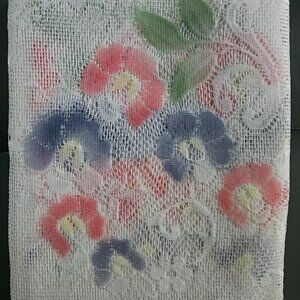 Two packs (2) Mainstays home hand painted lace panel with attached swag Width 56 inches x Length 63 inches. White lace with pink & blue flowers & green leaves.