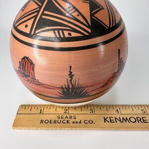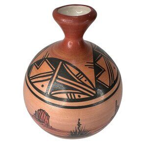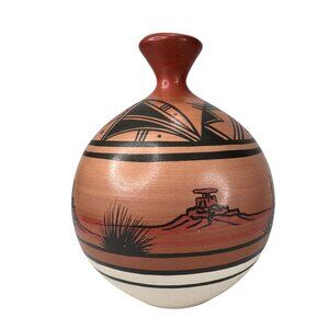 Authentic Signed Hand Crafted and Painted by Navajo Native American Artist Curtis Yanito, a Dine artisan, this pottery vase evokes the spirit of the desert. The intricate hand-painted scenes and geometric patterns tell stories of the "Valley Wind," capturing the essence of nature's beauty and Native American artistry. A collector’s piece and a tribute to cultural heritage.