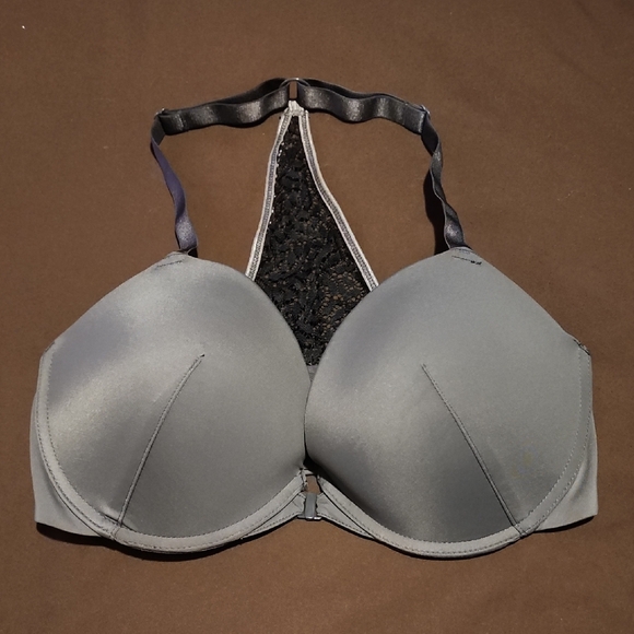 Experience comfort and style with this elegant gray lace racerback bra. Perfect for everyday wear, it combines a sleek design with delicate lace detailing. Front close. Padded Push up. new less tags 34DD.
