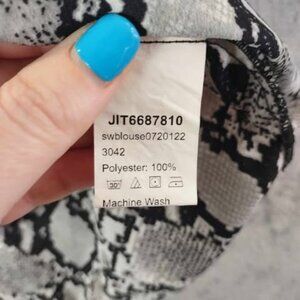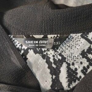 Edgy and stylish Shein Curve short sleeve top in a bold snakeskin print. Features a soft black collar with a V-cut keyhole neckline and subtle flutter sleeves. Lightweight 100% polyester fabric with a silky feel. Flattering A-line shape offers ease and comfort for everyday wear or going out.