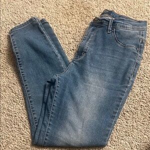 These blue skinny jeans feature a medium wash with a naturally worn-in look, highlighted by subtle fading and whiskering patterns. The denim's gradient effect adds a touch of style, making them perfect for casual outings.