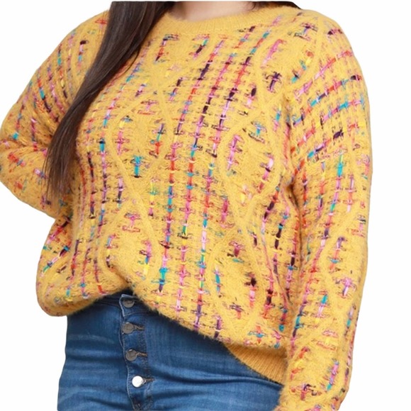 Features: chunky crochet knit pullover, multi color, acrylic poly blend, long sleeve, pullover