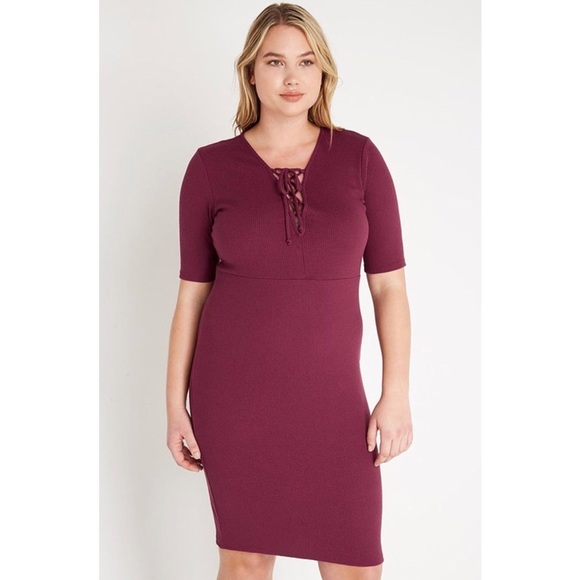 A ribbed bodycon dress is an absolute must have this season. It is the perfect transitional piece as it can be worn on its own or layered with a fall sweater or coat. Complete with elbow length sleeves, lace-up neckline, and midi length. This dress is unlined. Color: Burgundy