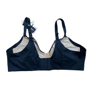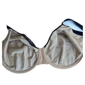 Seamless, underwire cup has supportive, minimizing, shaped sueded lining for comfortable, sustained hold.Smooth, flat lace overlay with opaque background.V-style neckline has sewn-on elastic edge for fit.Center - lace triangle panel has supportive, breathable mesh backing and bow and goldtone metal charm at top.Raised, reinforced panels at sides of cups help smooth away ripples and bulges beneath underarms.Tall smoothing sides and back have reinforced, bonded stretch edges at top and bottom.Silky, wide-set, non-stretch fabric straps provide full adjustability, non-bounce support, and adjust at back with coated metal hardware.Hook-and-eye closure at back has soft lining and coated metal hardwareDiscontinued style