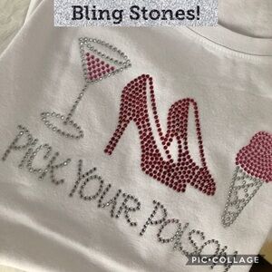 Curvy Divas: White Short Sleeve T-Shirt w/Bling Words & Design. What’s Your Poison? True to size. White only