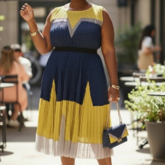 Colorblock pleated midi dress featuring shades of navy, yellow, and neutral tones. Sleeveless design with a fitted waist and flowy pleated skirt for a flattering silhouette.