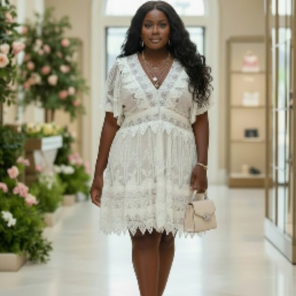 White lace dress featuring a V-neckline, short sleeves, and a fitted waist with a scalloped hem. Purse not included.